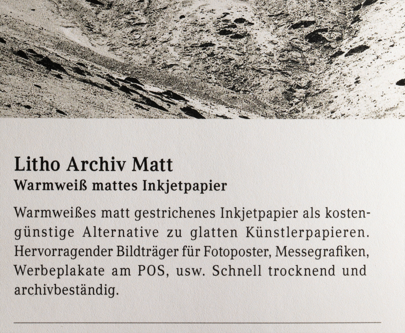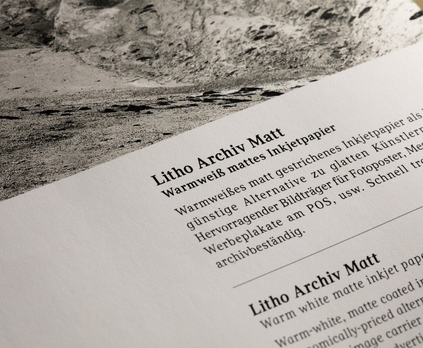 Litho Archiv Matt is a completely redesigned inkjet paper in a warm-toned, light ivory-white coloration which, thanks to its excellent price/performance ratio, represents a real alternative to the classic smooth artist papers and is suitable for a wide range of users. The special coating for water-based printer systems on the front enables a high ink absorption capacity with excellent drying properties, a wide color gamut and impressive, brilliant colors. Photographers will also appreciate this inexpensive paper, as resolutions of up to 5,760 dpi can be reproduced razor-sharp with this modern inkjet paper. We recommend Litho Archiv Matt for high end photo posters, portfolio folders and photo albums, exhibitions and trade fair decorations. It is also the first choice for impressive rendered architectural images and technical visualizations. The paper is fully archival resistant and meets all the requirements of DIN EN ISO 9706.