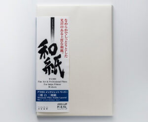 Processing and storage of Mitsumata Double Layeredshould take place in a climate from 35 to 65% relative humidity and at a temperature from 10-30°C. It should be stored cool, dry, clean, and dustfree place in its original packaging. Wear cotton gloves and handle carefully as surface is susceptible to abrasion and/or fingerprints. Use only archive grade tapes and glues for mounting and framing as well as archive quality envelopes, folders, and boxes for storage.