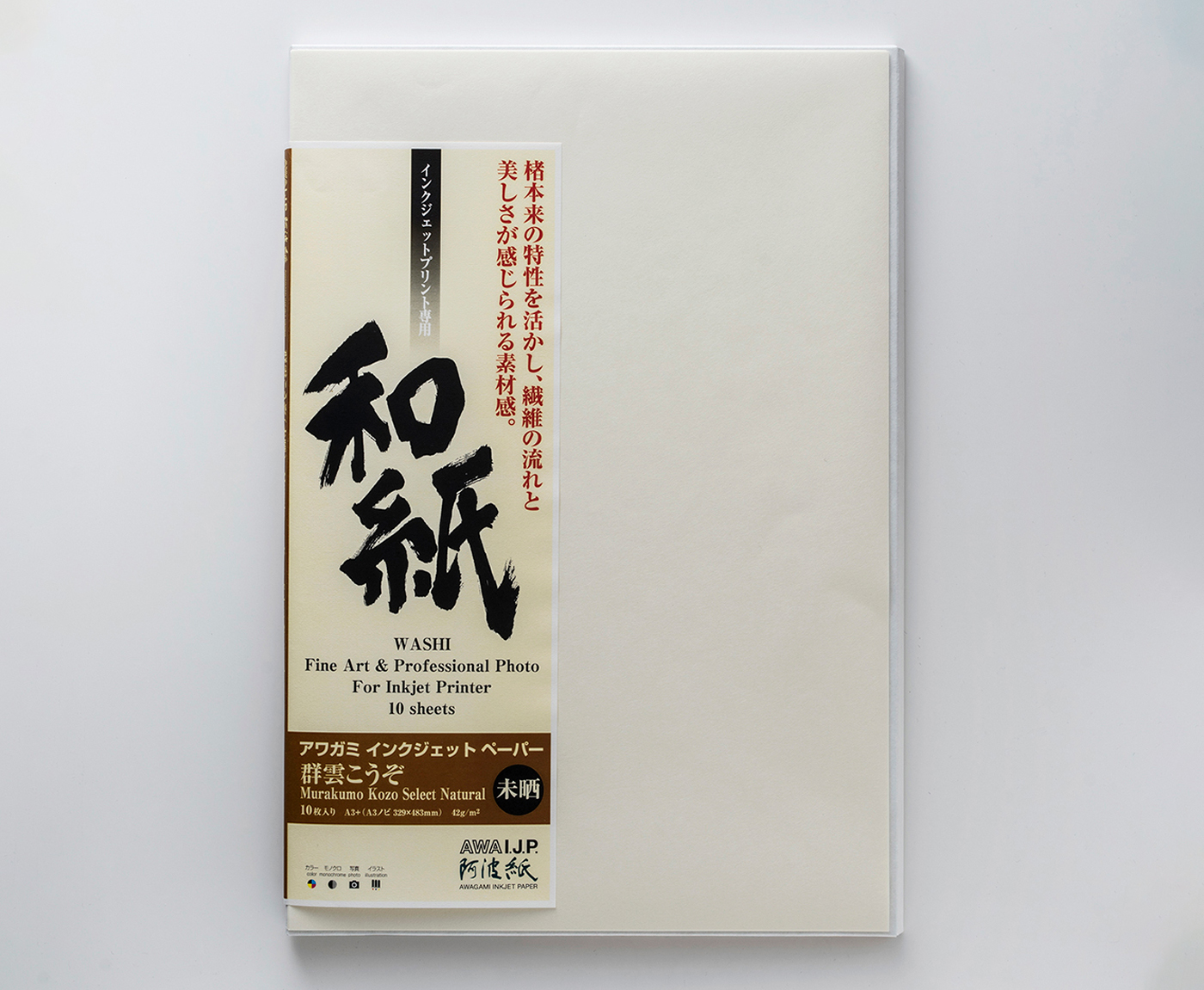 Murakumo Kozo is made of a blend of 90% Kozo fibres and only 10% alpha cellulose. The Kozo raw material is obtained from the bark of the mulberry tree. Pure kozo’ s sinewy yet natural soft fibers imbue Murakumo Kozo Select with an appealing rustic beauty and lasting organic charm. The papers’ lovely texture makes it highly desirable for the printing of Asian artworks while lending a tactile beauty to photographs, giclee’ prints and artists books. Furthermore, this fine art paper’s unparalleled strength vs. thinness ratio makes it ideal for both hanging scrolls and folding screens, too. Due to the papers high kozo fiber content, tiny organic matter may occasionally be found.