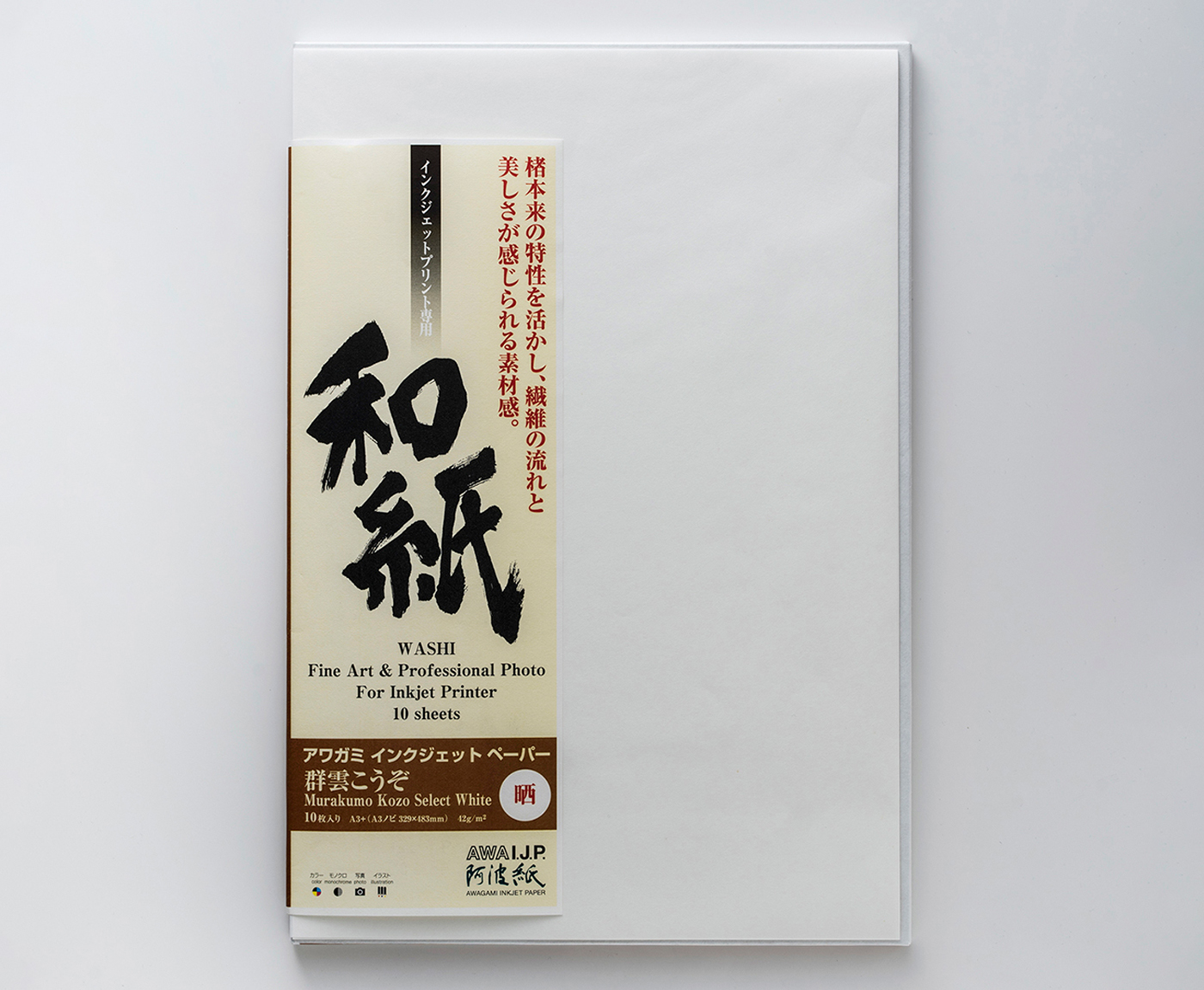 Murakumo Kozo is made of a blend of 90% Kozo fibres and only 10% alpha cellulose. The Kozo raw material is obtained from the bark of the mulberry tree. Pure kozo’ s sinewy yet natural soft fibers imbue Murakumo Kozo Select with an appealing rustic beauty and lasting organic charm. The papers’ lovely texture makes it highly desirable for the printing of Asian artworks while lending a tactile beauty to photographs, giclee’ prints and artists books. Furthermore, this fine art paper’s unparalleled strength vs. thinness ratio makes it ideal for both hanging scrolls and folding screens, too. Due to the papers high kozo fiber content, tiny organic matter may occasionally be found.