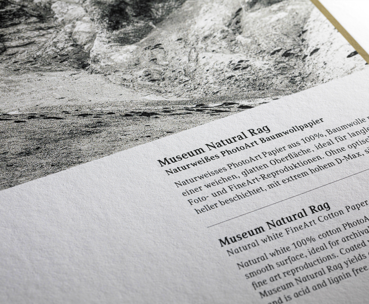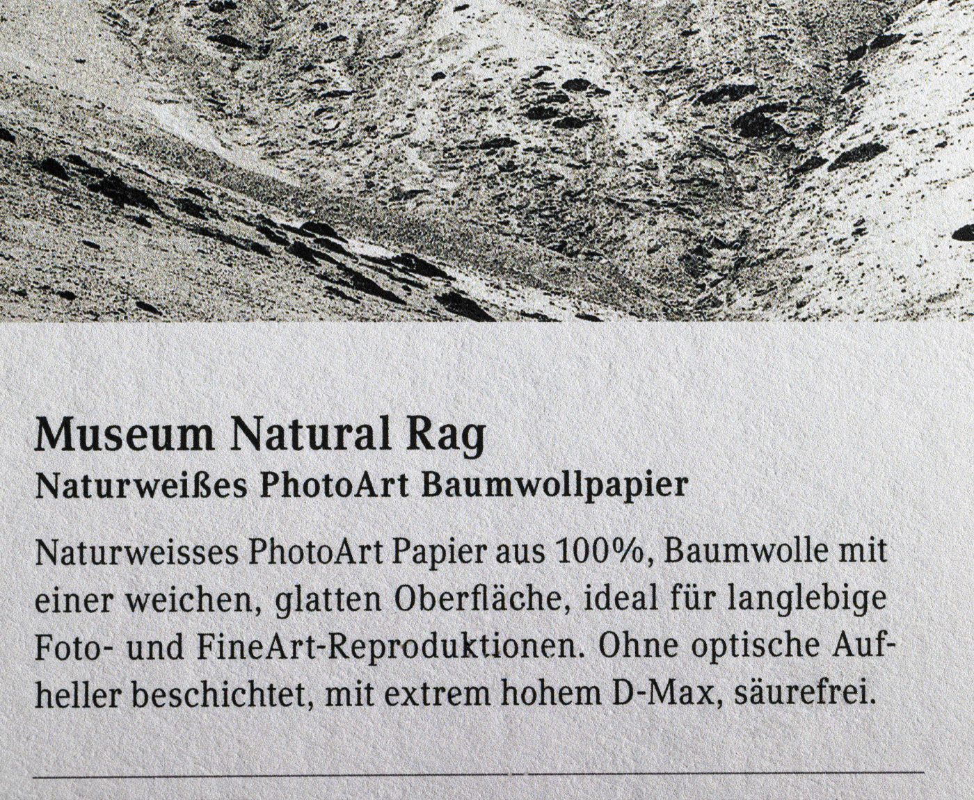 is a natural white, traditional PhotoArt paper made of 100% cotton with a soft, typical rag surface. A distinctive paper with ideal paper weight for long-lasting photo and fine-art reproductions. Made without optical brighteners and acid-free, for premium prints with extremely high D-Max values and very large colour space.