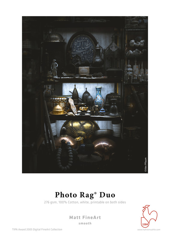 “Photo Rag DUO” was designed for digital use with the structure, the feeling and the grace of traditional materials. It is distinguished by its velvety, white surface and it consists of 100% cotton. Thus it is suitable for photographic use and photo-realistic productions. “Photo Rag DUO” is available in two weights, a medium and a heavy quality with a mat inkjet coat on one side. This product was designed with regard to the exacting user in such a way that is can be used for all prints the look and surface of which require a high quality. “Photo Rag DUO” achieves a harmoneous high color intensity and exact sharpness of outline with both, pigmented and dye-based inks on various printing systems. All the fine papers and board from the mould made paper mill at Hahnemühle are manufactured in accordance to DIN 6738 / ISO 9706. All papers produced as per these standards are 100% acid-free and have a neutral phvalue, so that they are extremely non-ageing over several centuries.