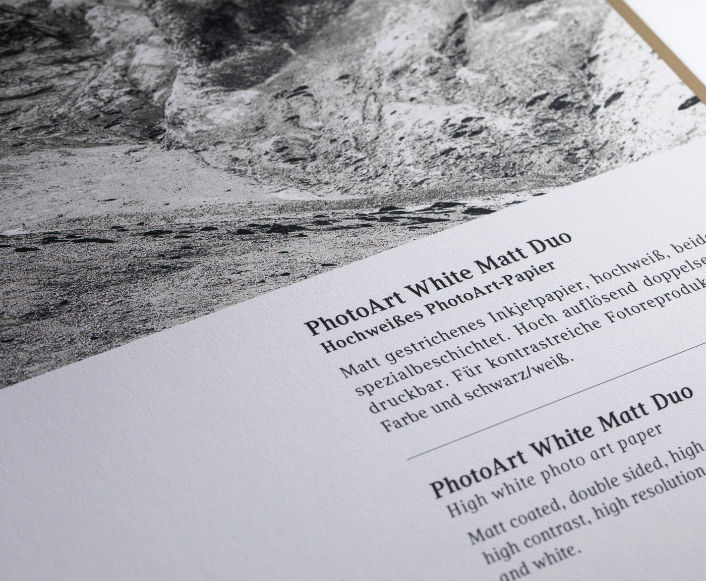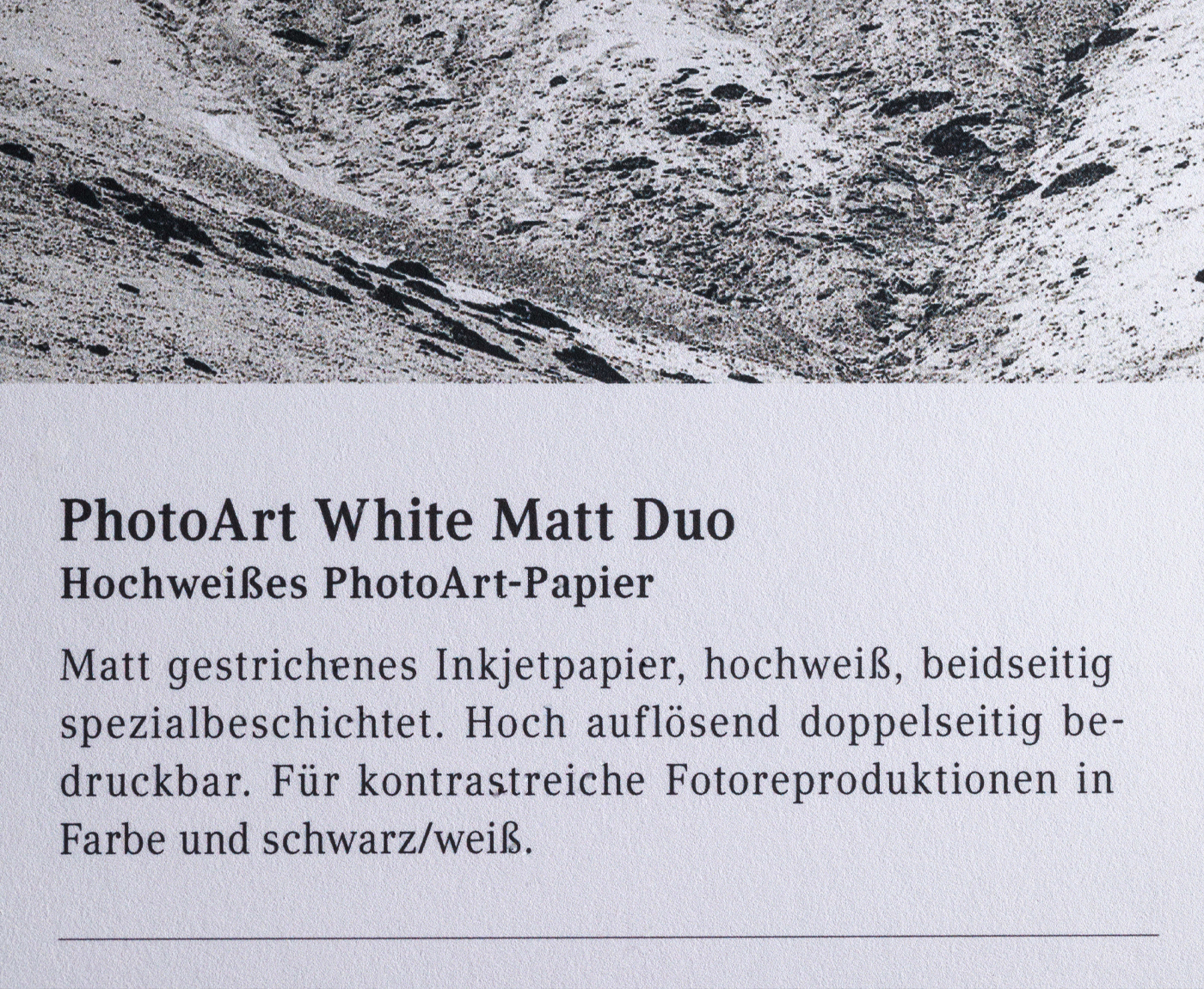 PhotoArt White Matt Duo ist ein hochwertiges FineArt Papier mit einer speziellen doppelseitigen Beschichtung für Inkjet-Drucker bestens geeignet. Die matt gestrichene, hochweisse Oberfläche ist homogen geschlossen und auf beiden Seiten gleichmäßig aufgetragen. Damit empfiehlt sich dieses PhotoArt Papier für die doppelseitige Ausgabe von hochwertigen Fotodrucken mit hoher Auflösung und brillanten Farben bei kurzer Trocknungszeit.