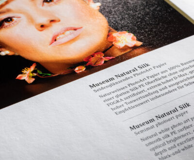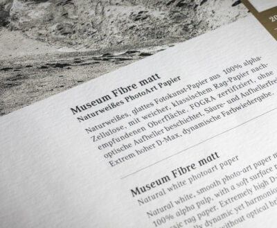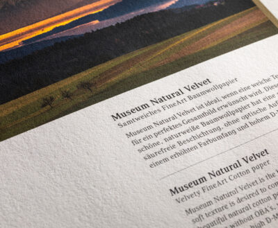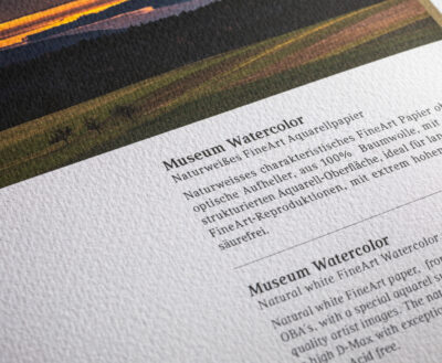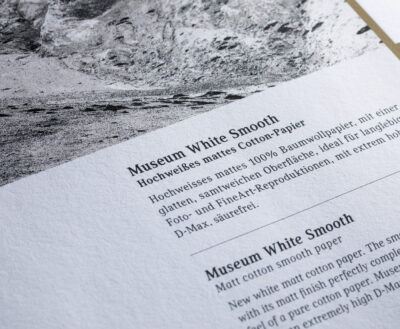 Sorte}, like Museum Natural Rag, is a natural white, traditional PhotoArt paper made of 100% cotton, a little heavier in paper weight, with a soft surface and a little less, rather reserved structure, for long-lasting photo and fine-art reproductions with very high quality. Made without optical brighteners and acid-free, for valuable prints with extremely high D-Max values and perfect colour space.